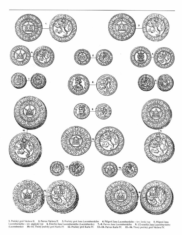 Pražský groš- poprvé ražen r.1300 za krále Václava II. v Kutné Hoře. Výborná jakost mince byla předpokladem jejího rozšíření po celé Evropě (Ag 0,932 ; m= 3,5 - 3,7g ). Postupně za dalších panovníků množství stříbra klesá a celková ražba je velmi nedbalá.